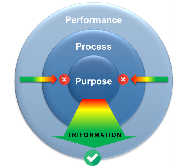 Triformation beschreibt die verschiedenen Ebenen einer Transformation: Der Außenkreis – Performance. Der Innenkreis – Purpose. Und dazwischen – das Spannendste: der Process.